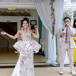 Drawing from lingerie traditions and the romantic architecture of Victorian dress, the silhouette was both intimate and commanding. Side panniers, once symbols of excess and performance, were reinterpreted as vessels of life—adorned with cascading flowers that hung like ripe fruit from a tree. These blooms moved as the wearer walked, mimicking the gentle sway of branches in bloom. In place of breast milk, these flowers became offerings: the way a mother nourishes her child, so too does the Earth nourish us.